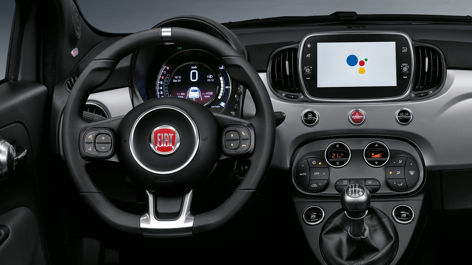 LIVREA PARTICOLARE – Le versioni Hey Google hanno una livrea giocata sui colori bianco e nero lucido per il tetto e per le calotte degli specchietti. Il badge Hey Google è posizionato sui passaruota, mentre i montanti centrali sono decorati con elementi ispirati sempre ai colori di Google. La fascia nella plancia è invece in colore argento opaco con logo 500 bianco e la firma “Hey Google” appare sulla schermata di benvenuto del display di bordo di 7”